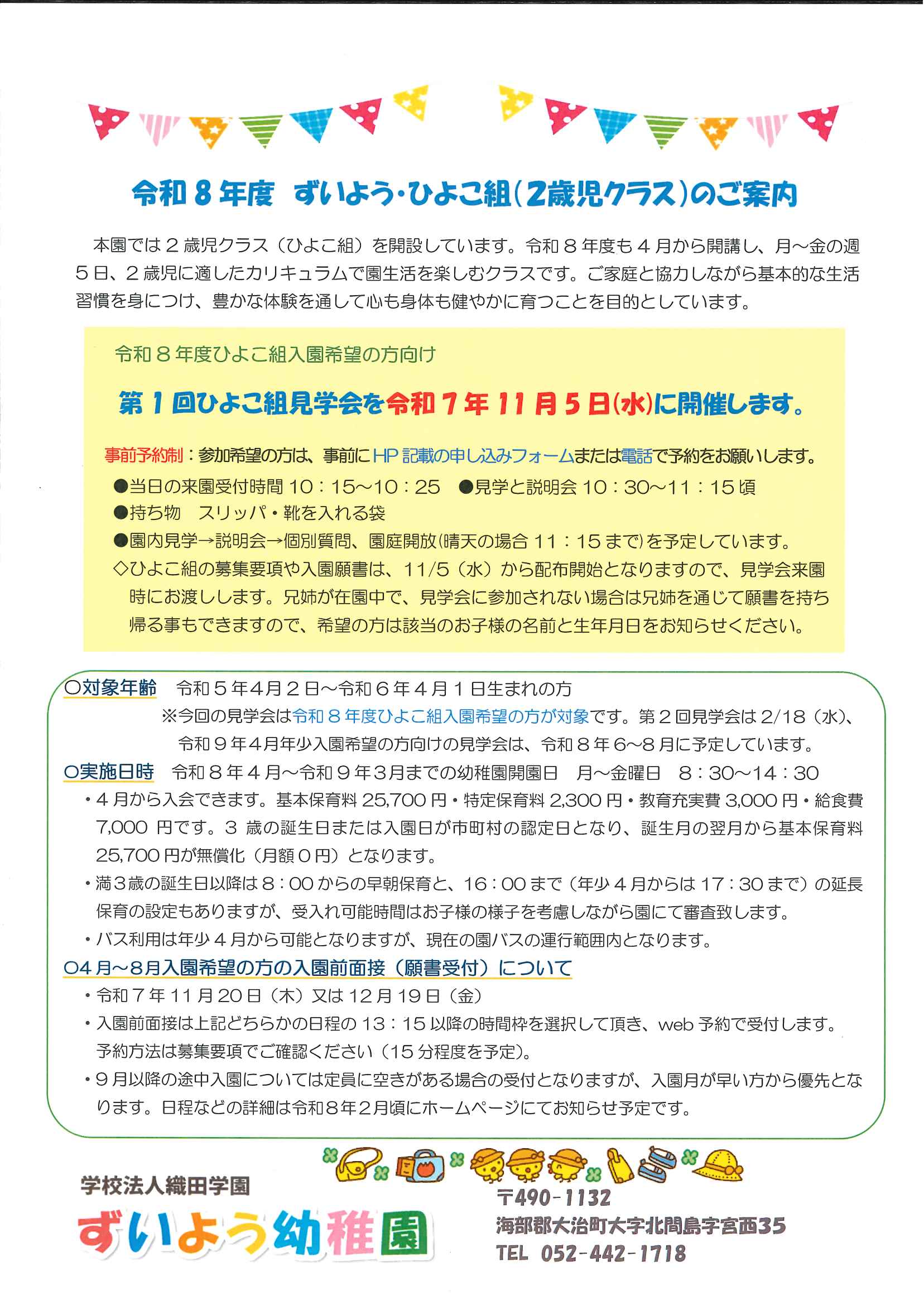 お知らせ (2) 2025-09-29 令和8年 ひよこ組(2歳児クラス)のご案内 令和7年11月5日(水)に令和8年ひよこ組入園希望者向けの見学会を開催します! 参加希望の方は、事前にホームページ内の入園案内に記載の「申し込みフォーム」または「電話」でご予約の上、お越しください。 2025-05-27 駐車場のご案内 お車でお越しの方は幼稚園駐車場をご利用ください。 1